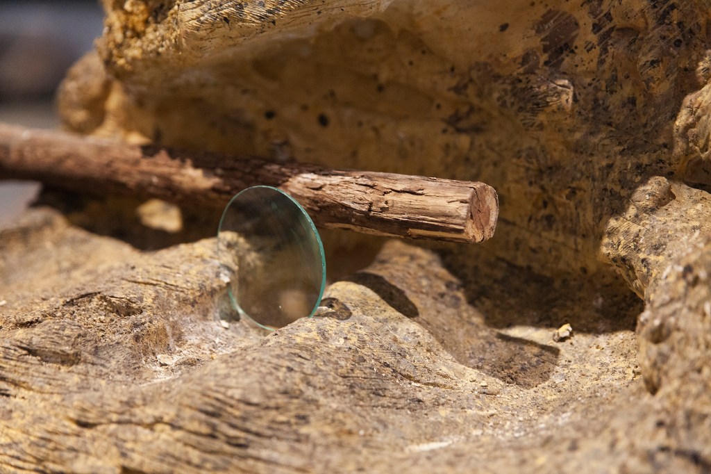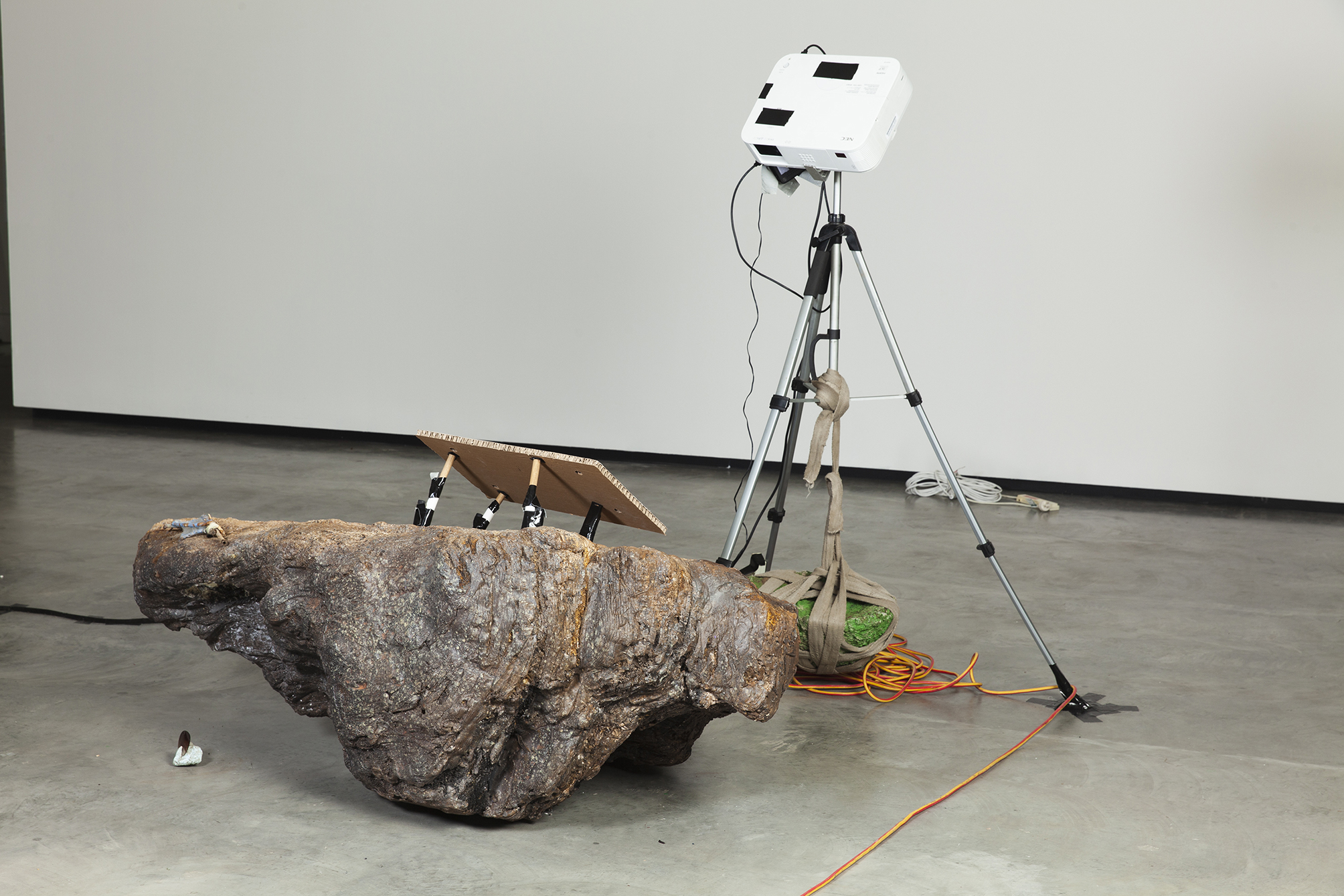 Bodies on a Rock transforms the familiar into the unfamiliar. Polystyrene-carvings pose as fictional rocks; whipper snippers become steady cams; mirror-coated snow gloves belie their previous life; torchlight and video projections on a t-shirt or pane of Claude glass illuminate the alchemy of Turner-Carroll’s artistic process.